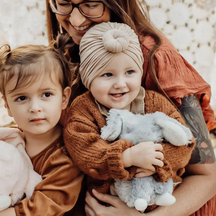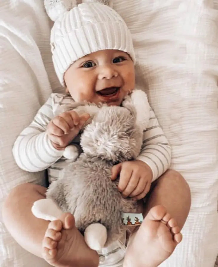 This is one chubby little grey bunny that you are sure to love. Shaggy grey fur and white details on this stuffed hare with it’s baby-safe embroidered face and sweet pink cheeks make it the perfect wee size for every one!