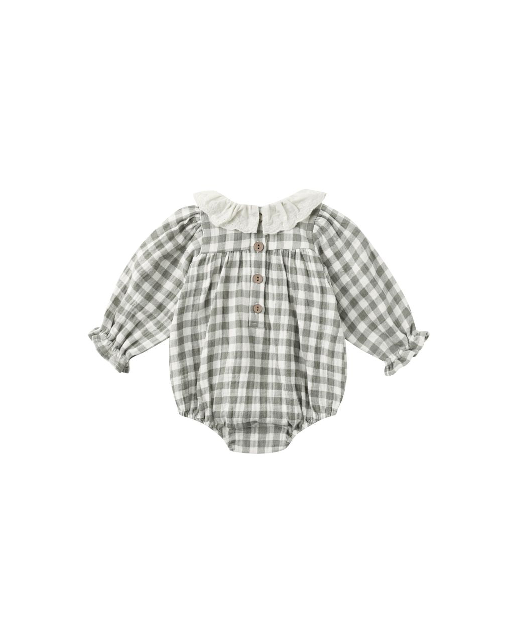 Our Callie Romper features a sweet embroidered collar, smocked front, and gathered long sleeves. Buttons at the back and snaps at the bottom make for easy dressing.