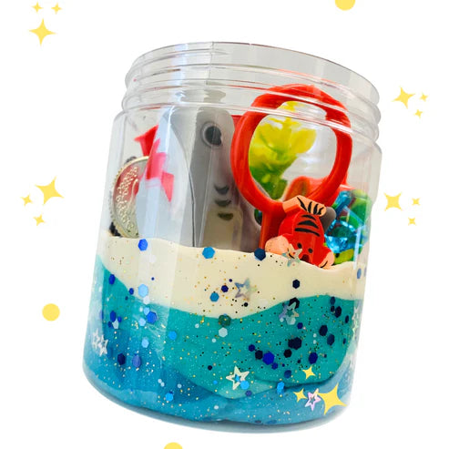 Dive into underwater adventures with our Super Size Ocean Dough Jar! This jar is packed with light and dark blue, and white dough, along with themed ocean trinkets that spark imagination and inspire new creations. Perfect for sensory play, it provides hours of fun for kids of all ages.