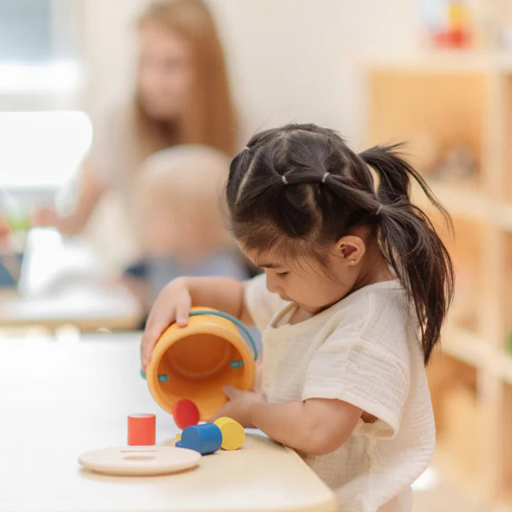 This shape-matching toy enhances hand-eye coordination and fine motor skills as children grasp and fit pieces into corresponding slots, refining precision and wrist control. It teaches shape recognition, problem-solving, and introduces the concept of object permanence, helping children understand that objects continue to exist even when temporarily out of sight. The lid opens for added engagement, while the bucket’s handle makes it easy to carry, promoting independent play. Children also develop an understanding of shapes while practicing grasping and placing objects. Set includes: 1 bucket with a lid featuring 2 holes and 6 blocks (3 coin-shaped and 3 cylinder-shaped in yellow, blue, and red).