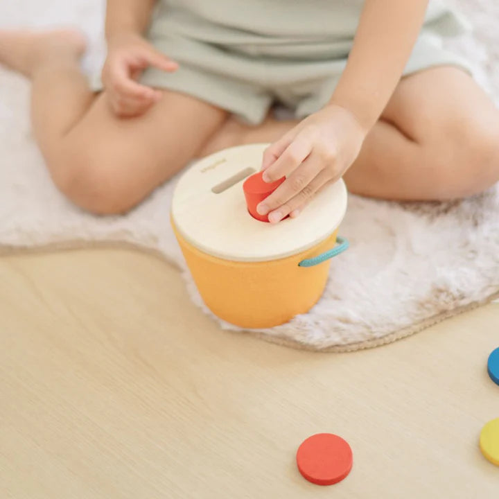 - Sustainably made in Thailand using chemical-free rubberwood, non-toxic glue, organic pigments, and water-based dyes. Set Includes: 1 bucket with lid (2 holes) and 6 blocks—3 coins & 3 cylinders in yellow, blue, and red.