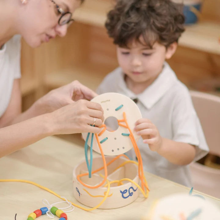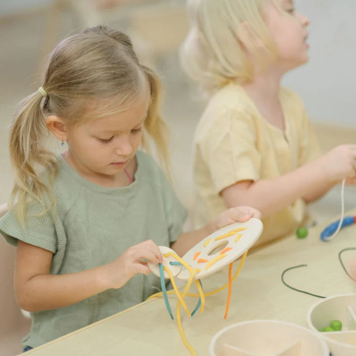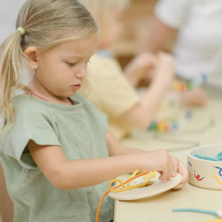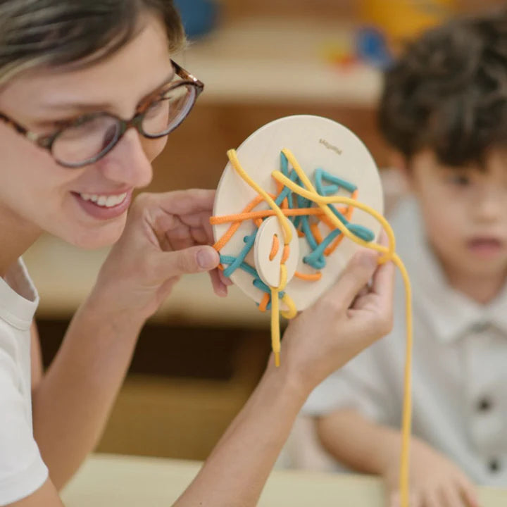 This tactile lacing activity strengthens fine motor skills, hand-eye coordination, and wrist control as children guide strings through a variety of openings. By exploring different threading patterns, they refine their concentration, precision, and patience while engaging their creativity and problem-solving skills. The activity also reinforces color recognition, pattern formation, and early self-care abilities—laying the groundwork for tasks like tying shoelaces. It doubles as a storage box for easy organization. Set Includes: 1 large round disc, 1 small round disc, 4 strings (240 mm), and 3 strings (1,110 mm).