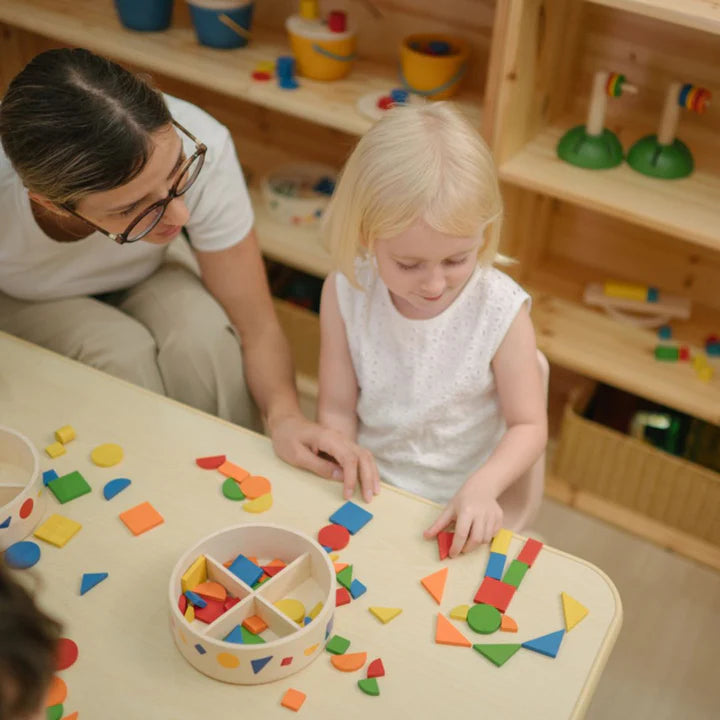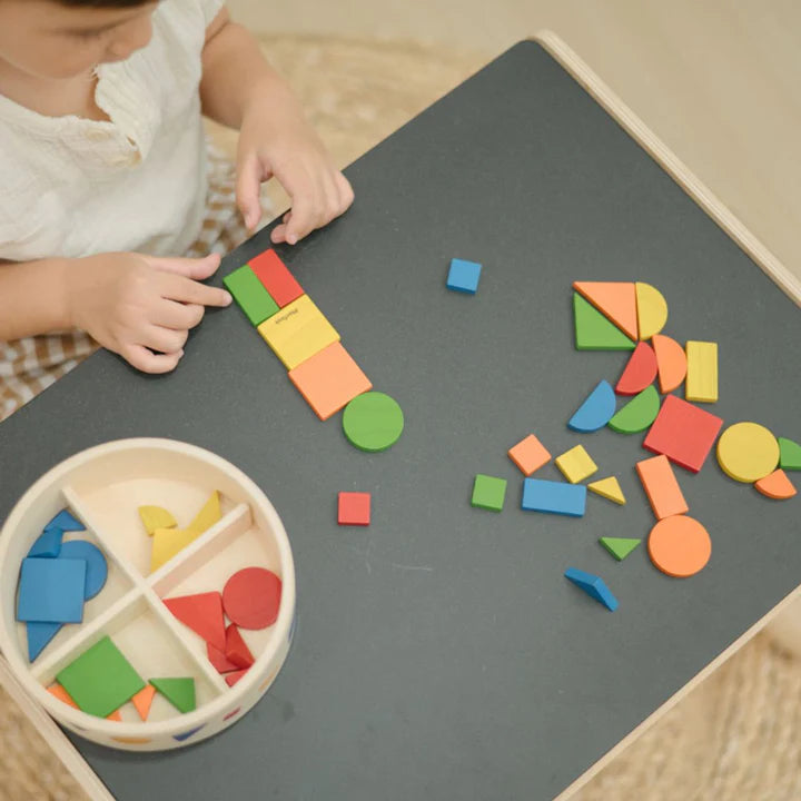 - Sustainably made in Thailand using chemical-free rubberwood, non-toxic glue, and water-based dyes. Set Includes: 45 geometric pieces (9 each in red, blue, green, yellow, and orange) with a container for easy organization and to prevent loss of pieces.