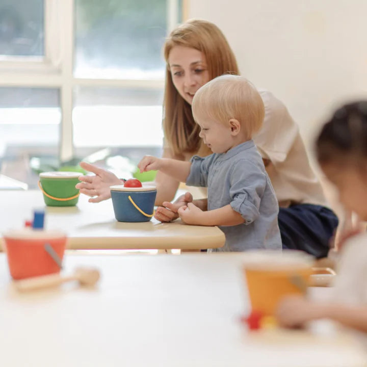 - Sustainably made in Thailand using chemical-free rubberwood, non-toxic glue, organic pigments, and water-based dyes. Set Includes: 1 bucket with lid (1 hole) and 1 red ball