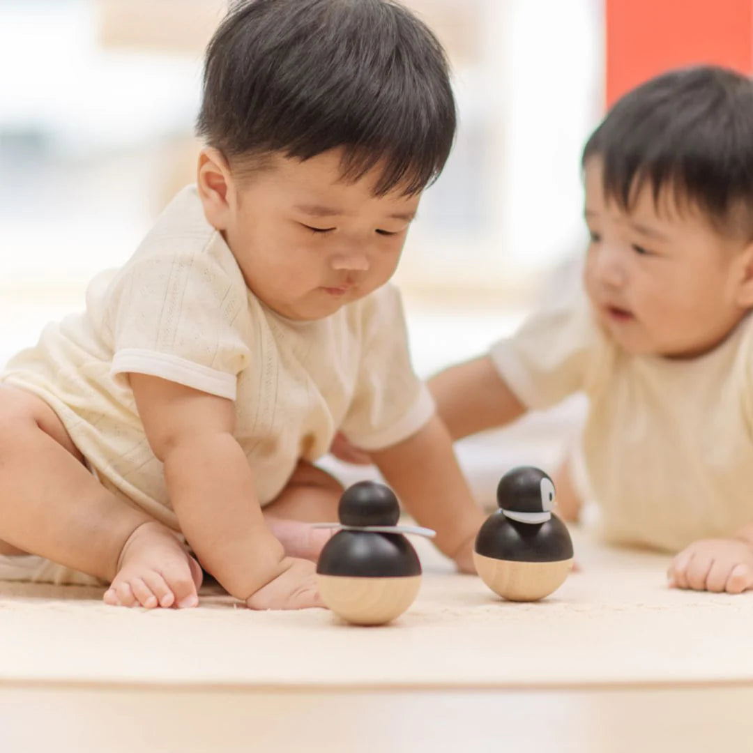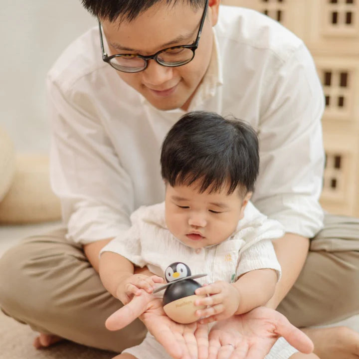 Fully embrace the penguin wobble through play! The Penguin Wobbler engages infants from birth, stimulating visual tracking, reaching, and movement. Newborns focus on its motion, while tummy time strengthens neck and core muscles. By 3–5 months, babies reach for it, refining hand-eye coordination, and by 5–6 months, they push it themselves, learning cause and effect while building motor skills for crawling and beyond.
