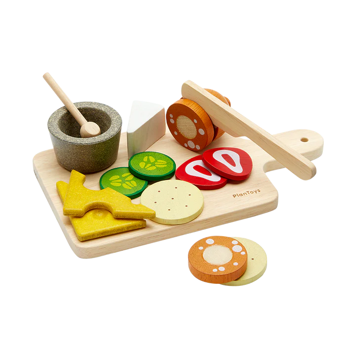 Everyone loves a charcuterie board! With this set, children can prepare a European-style appetizer that’s guaranteed to impress their guests. This set includes 2 pickled cucumbers, 2 strawberries, 2 crackers, 1 block of brie cheese, 2 slices of gouda cheese, 1 sliceable roll of salami, 1 knife, 1 sauce cup, 1 spoon, and 1 cutting board. Expand upon the meal with other PlanToys pretend foods and kitchenware.