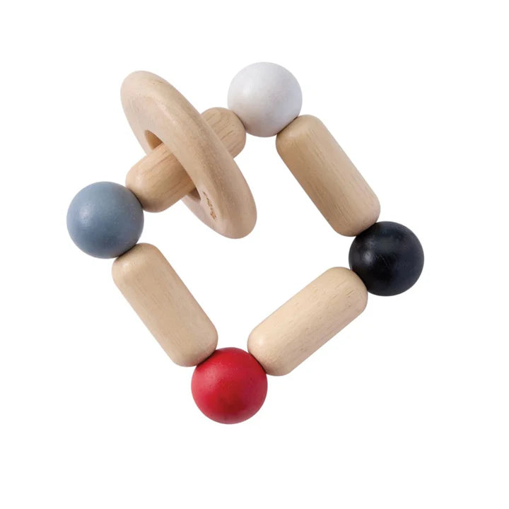 This is a flexible, square-shaped wooden toy featuring colorful red, white, black, and gray beads that slide and rattle. As babies grip and squeeze its bendable frame, it helps develop fine motor skills and hand-eye coordination. The rattling sounds support auditory development, while the toy encourages tactile exploration, bilateral coordination, and cognitive growth through cause-and-effect learning, offering complete sensory stimulation. High-contrast colors are especially beneficial for young babies, as they are easier to see and help develop visual focus.