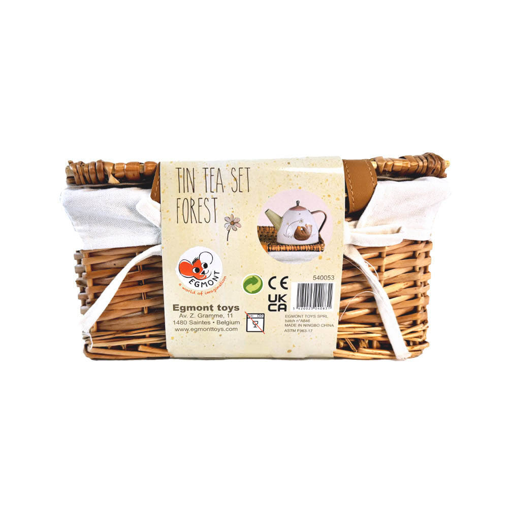 Classic tin tea set is perfect for a tea party: invite your friends, your dolls, your stuffed animals! Includes 4 cups and saucers, 4 plates, tin tea pot and a tea towel, in an adorable wicker case.