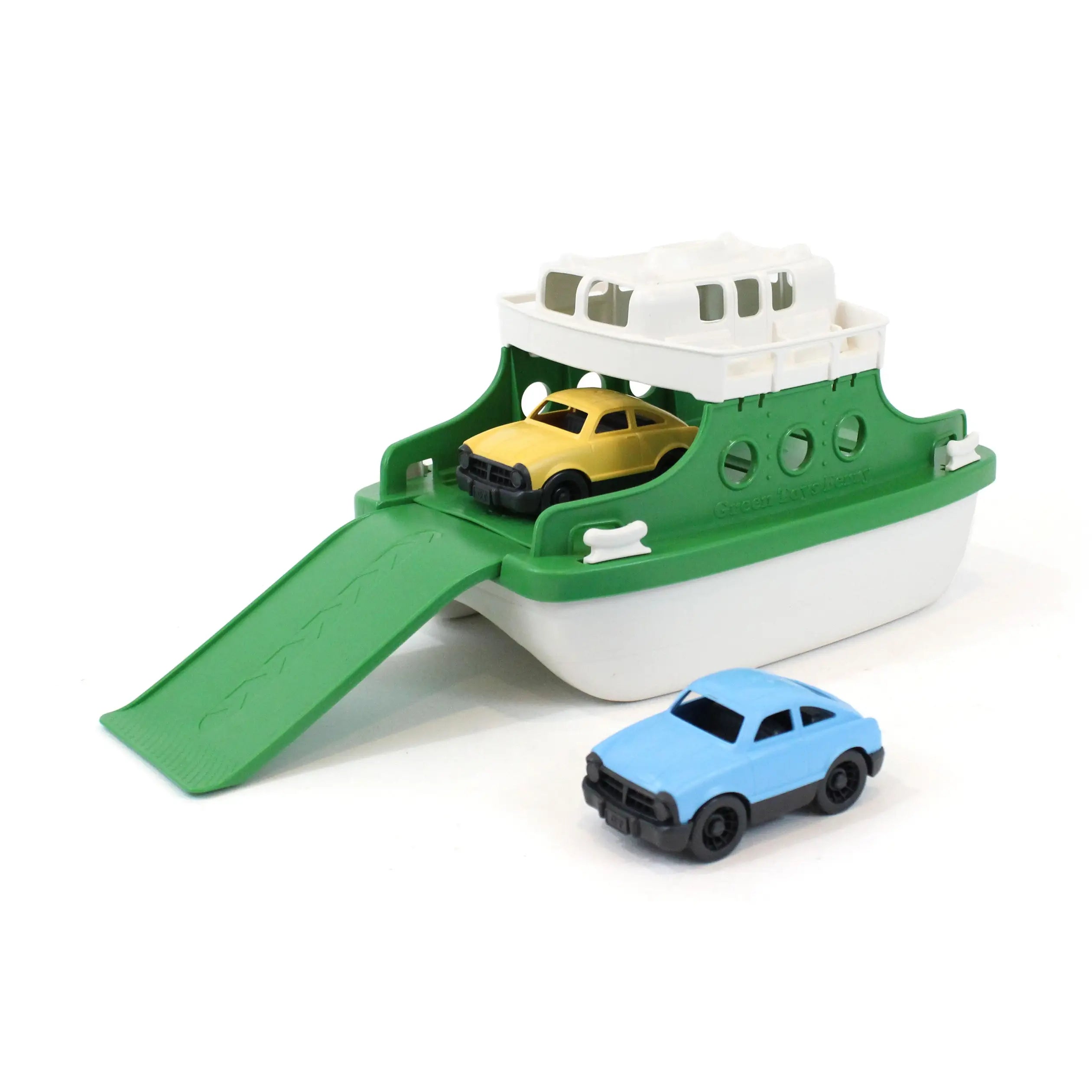 Set sail with the Green Toys™ Ferry Boat for a quick bathtub excursion or an extended trans-pool voyage. Whatever the adventure, this two-story vessel is ready to hit the open water with room for eco-friendly cargo galore, and even comes with two Green Toys™ Mini Fastbacks. Use the slide-out ramp to load up the spacious bottom level that accommodates up to four Green Toys™ Mini Vehicles or Fastbacks. The open top deck features two small benches on each side, as well as eleven windows looking down into the main level. Made in the USA from 100% recycled plastic, this craft is ideal for any body of water – durable, buoyant, and dishwasher safe. The hull also detaches for easy cleaning. No BPA, phthalates, PVC, or external coatings. Packaged using recycled and recyclable materials and printed with soy inks. Recommended for ages 3 and up.