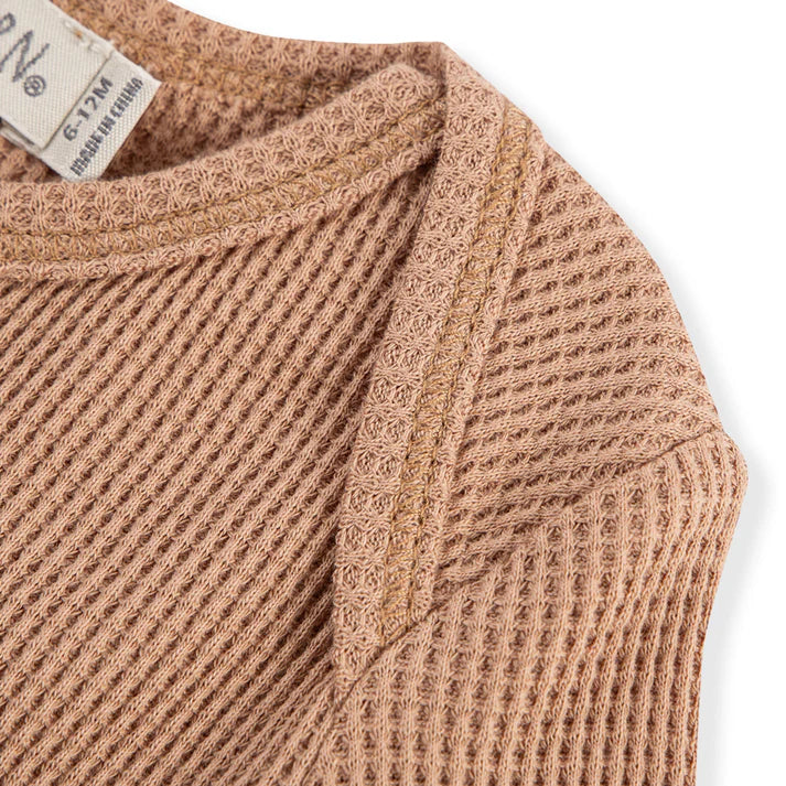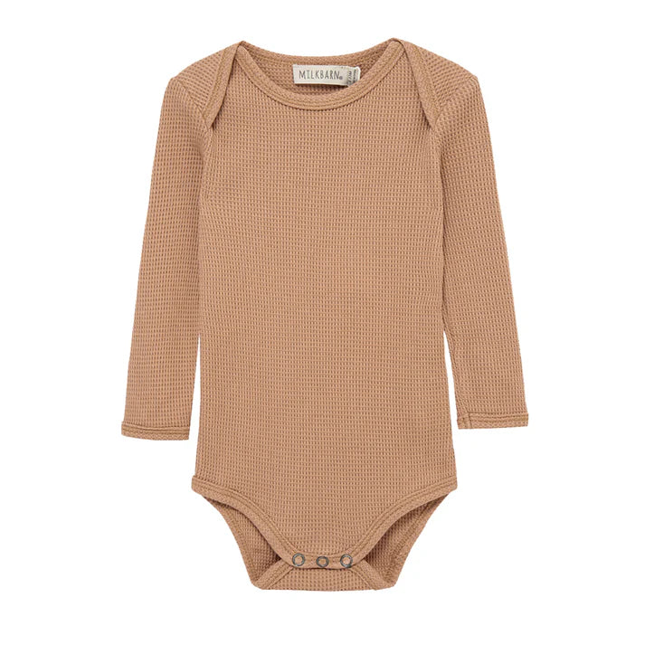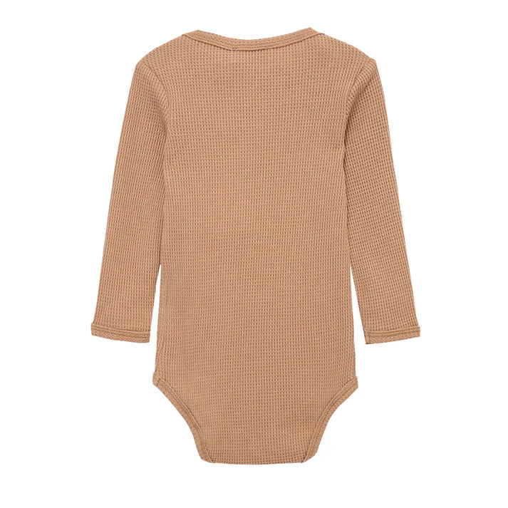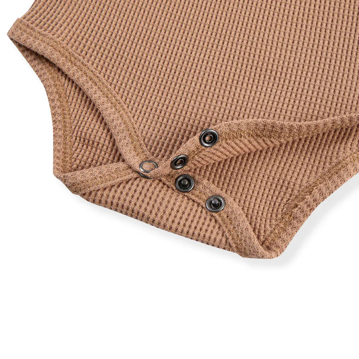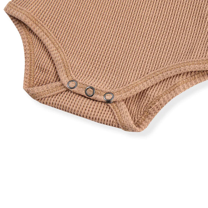 Whether worn alone or paired with other Milkbarn treasures, elevate your little one’s wardrobe with our soft, all-season Waffle Long Sleeve One Piece in the Tawny Rose print. The envelope neckline and ring-snap closures allow for effortless, one-handed undressing of your baby. The contrasting edging highlights the structure and fabric design.