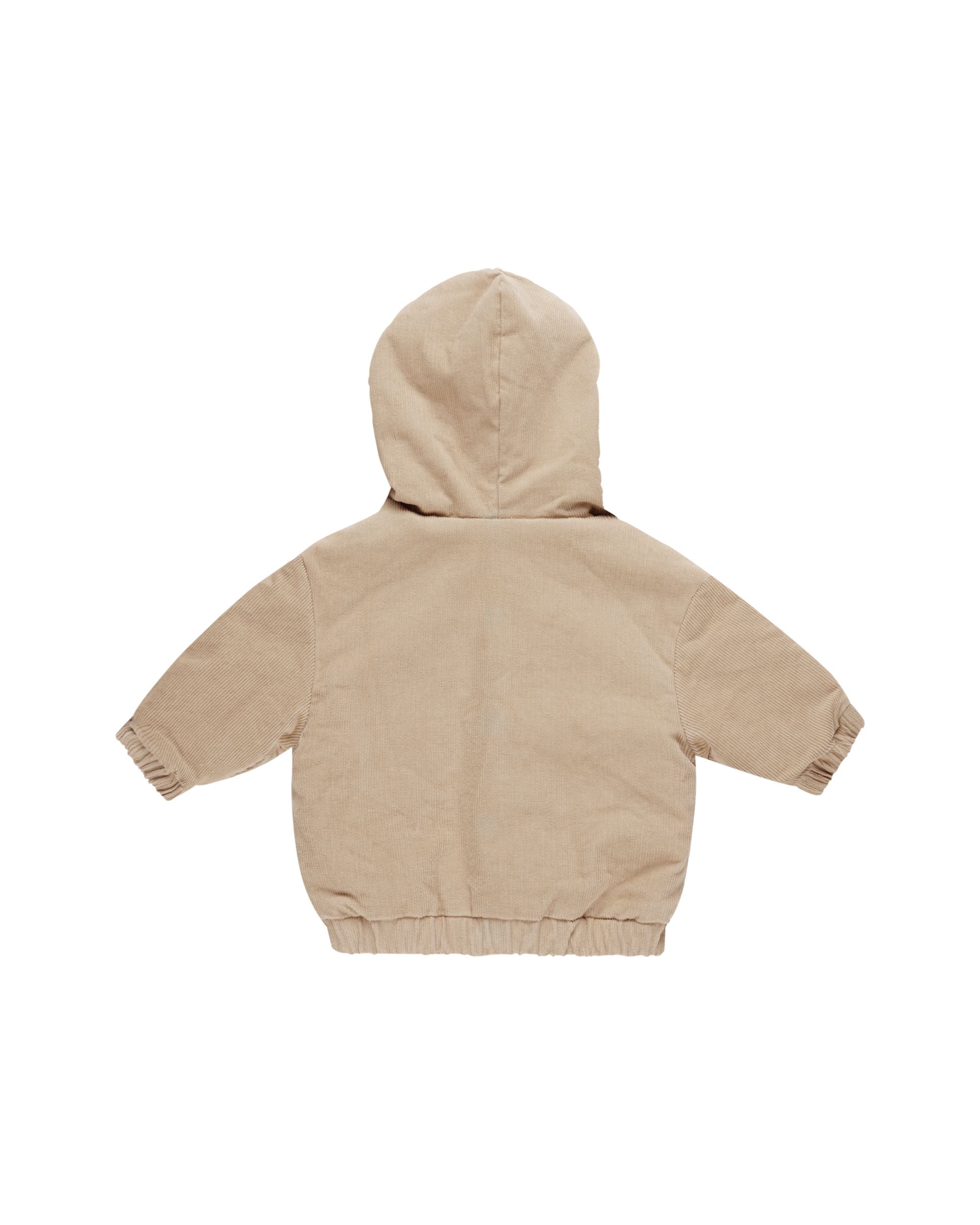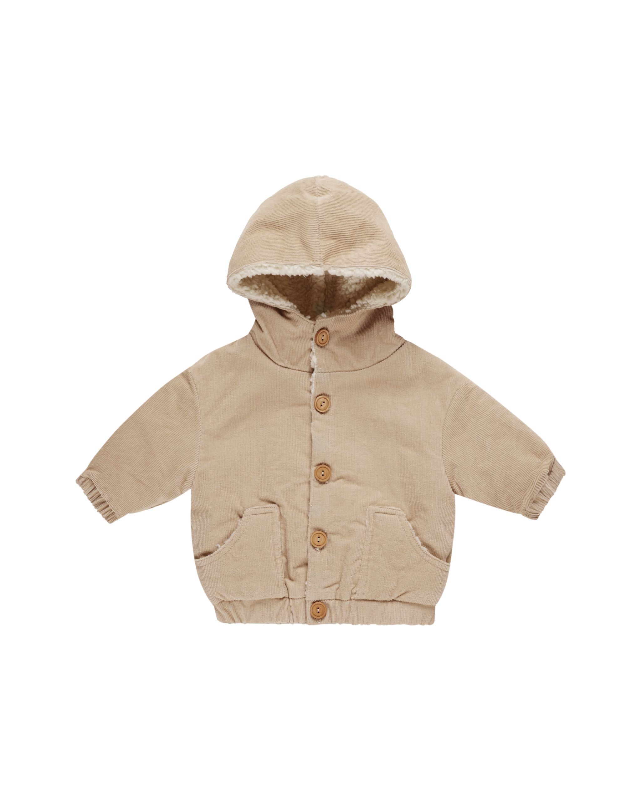 Our hooded jacket is made in our soft corduroy fabric, with a soft sherpa lining perfect for laying all season long. Featuring our 'latte' colorway. Care: Machine wash cold. Tumble Dry low. Shell: 97% Cotton, 3% Elastane, Lining: 100% Polyester