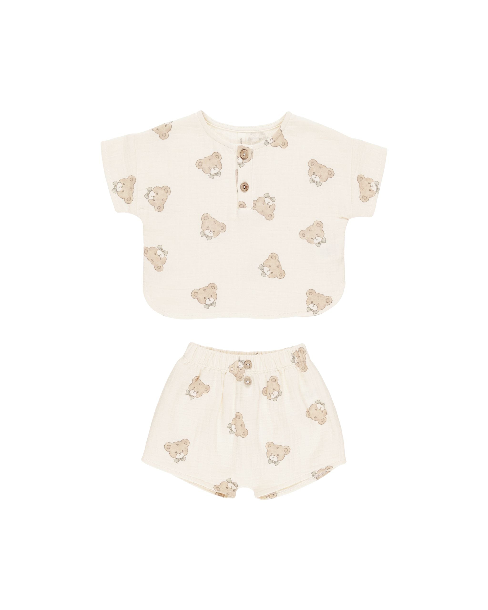 Woven set with a boxy tee and matching shorts makes for an easy go-to look for the season! Featuring coconut button detail at the back neck, and front short.