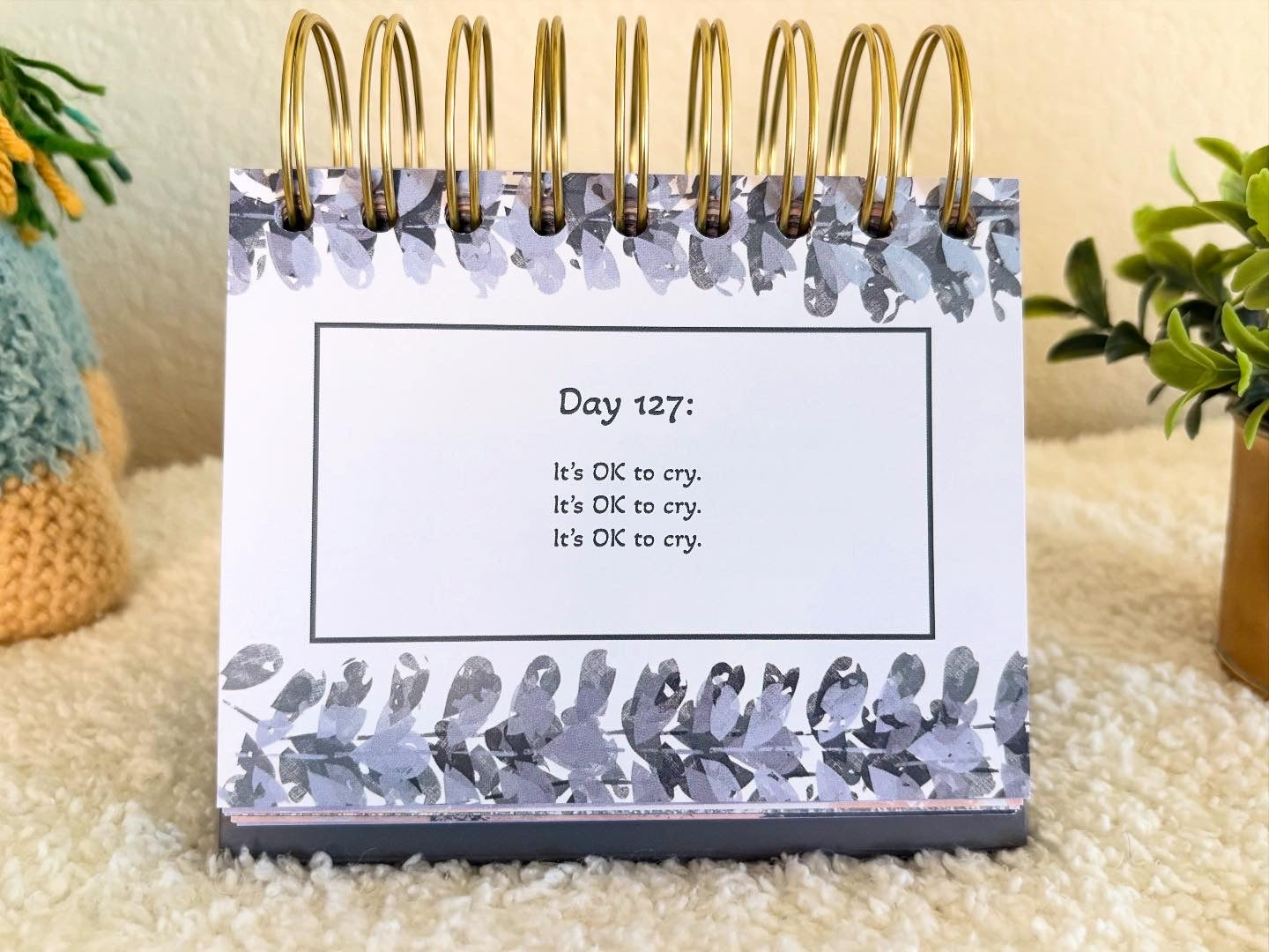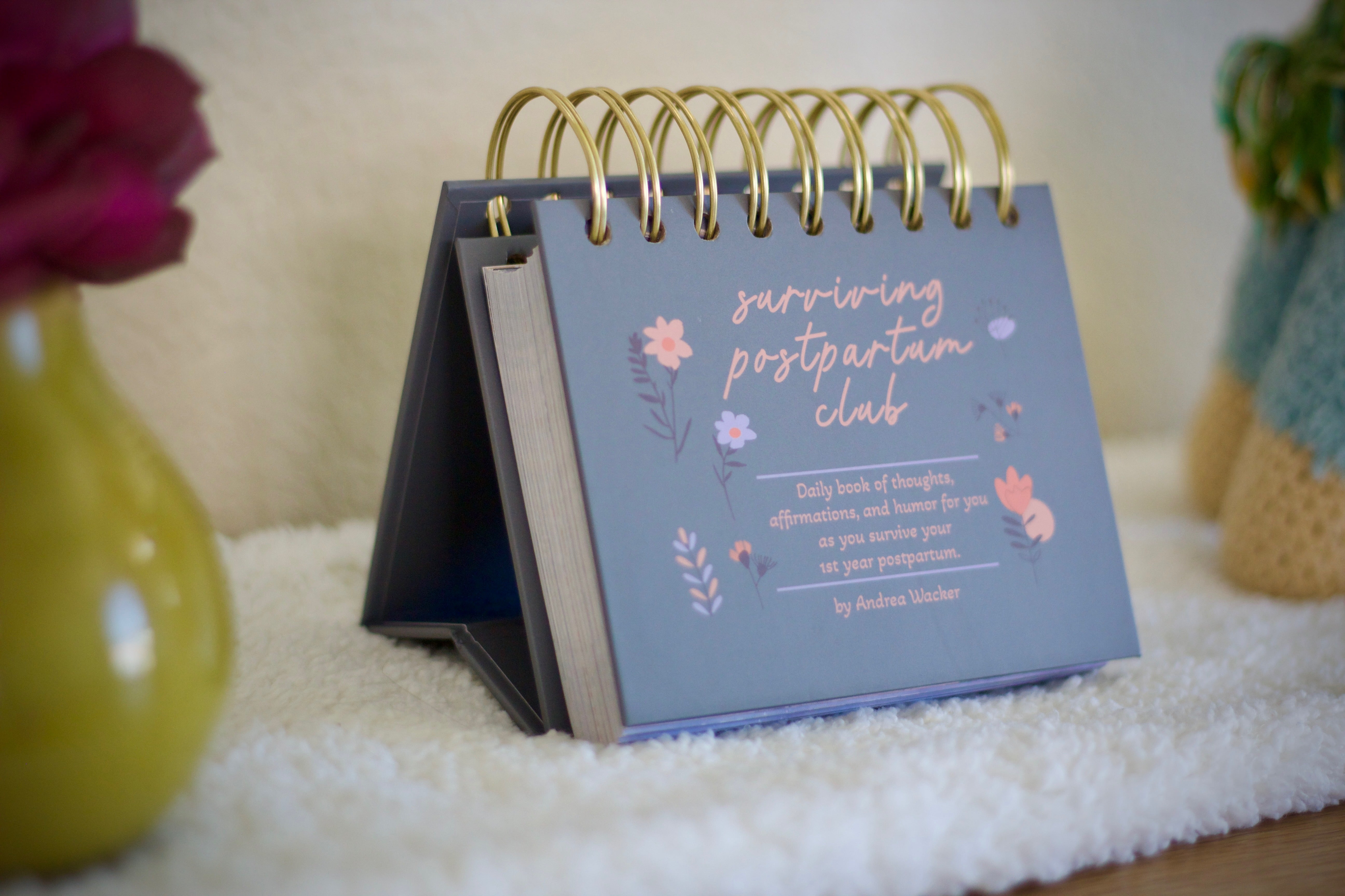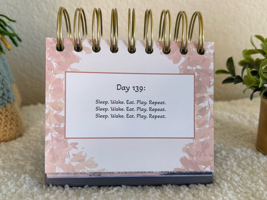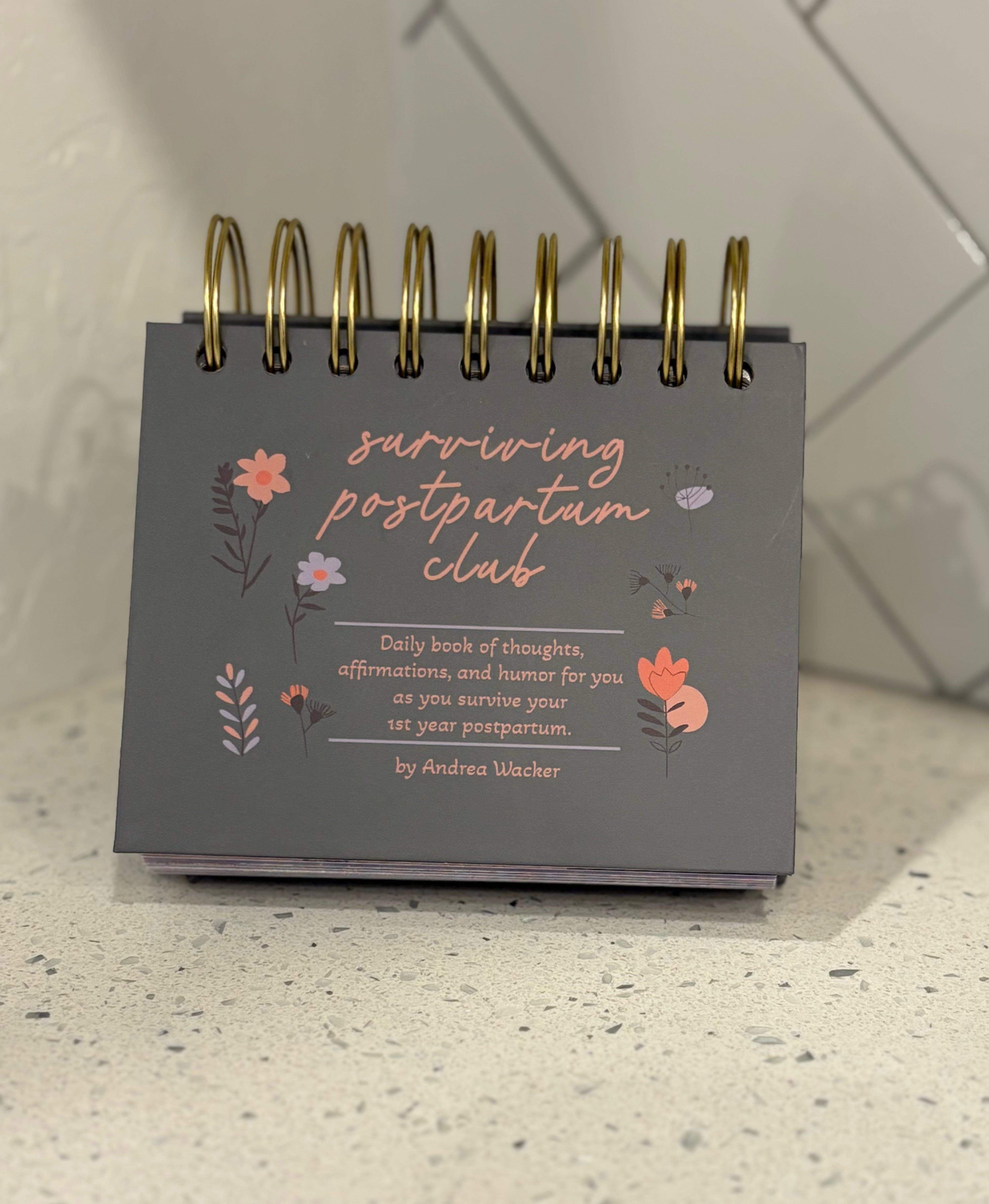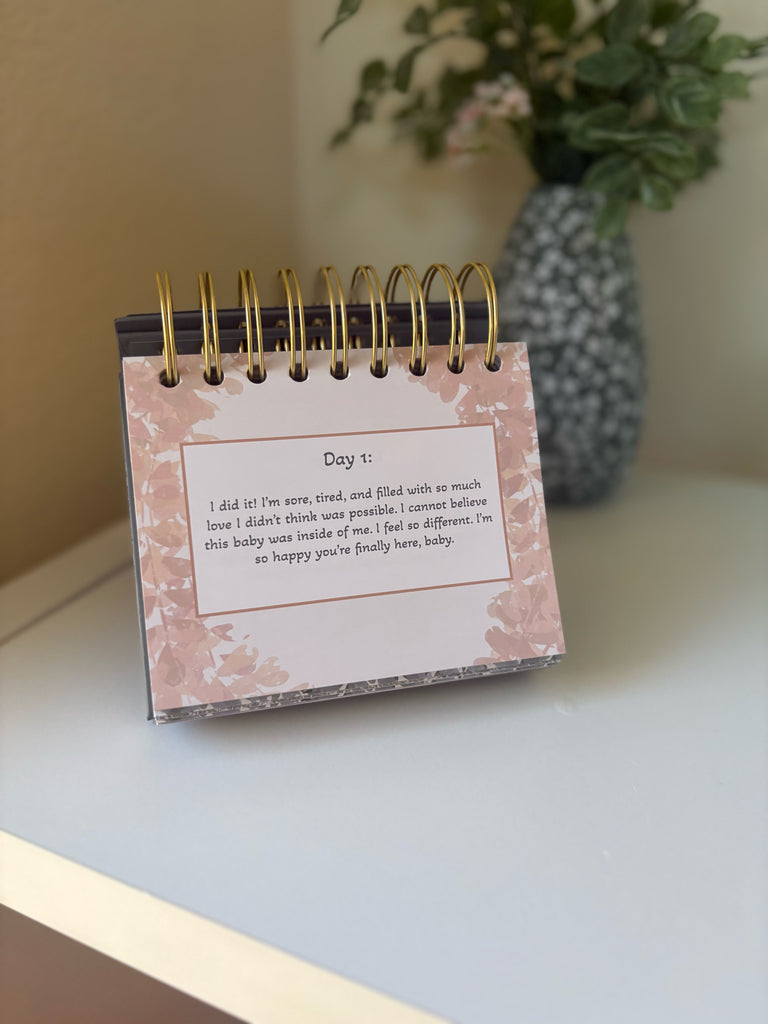 This daily postpartum flip book is filled with thoughts, affirmations, and humor to take you through your first year postpartum. Each day offers a thought related to postpartum, beginning from day one. Enjoy the full color throughout, gold-coil binding, and free-standing easel design. Perfect for you to read next to your nightstand, on the baby’s dresser, or even at your desk at work.